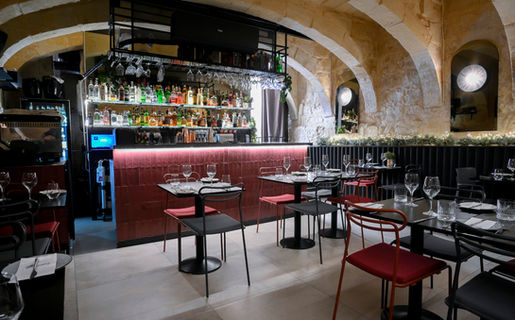 Six beautiful stone arches span the width of the restaurant, with a lower arched doorway allowing a glimpse into the kitchen. The interior décor displays a modern touch, with minimalist tables and cushioned chairs combining old and new to expand on the fusion concept of the restaurant. The colour scheme is earthy, with the dominant brown hues complemented by occasional touches of deep red—and with light orange added by the two sofas at the back. The modern bar features a chic black countertop and is enclosed by classic maroon tiles.