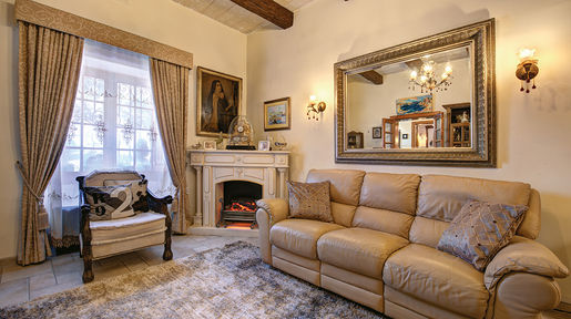 Another problem was that despite its pleasing design the house was essentially lacking in character. The rustic floors went a long way to improving the situation but after careful thought and consideration it was decided that wooden ceiling beams would give a certain sense of continuation to the theme that was developing. These beams, though not original to the house, definitely add a certain something and I was surprised to discover that they are not actually real wood but a clever imitation – albeit very cleverly done and are particularly effective in the Sitting Room. Here we find a comfortable combination of practical furnishing and a number of family heirlooms – making for a mix of modern and traditional pieces that work well together. For example, the wooden wall unit is oak and was designed by the owner and custom made locally whilst the neutral coloured leather sofa is from Fino. The rather majestic looking fireplace, however, is actually a piece of history in itself and was brought from the Old Empire building in Sliema whilst the oil painting that hangs in the corner has been in the family for generations. Just like the sofa all soft furnishings have been kept neutral and add to the gentle ambience of this room.