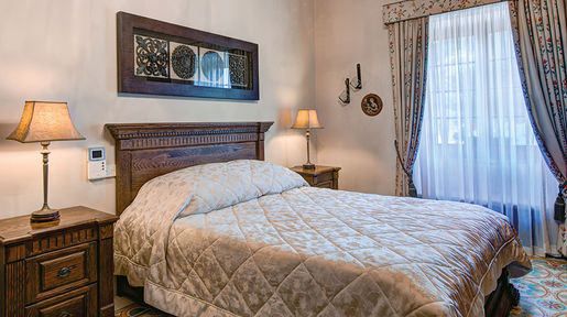 Across the hall we find the Dining Room, which, despite not being particularly large, allows for a clever combination of old and new to create an intimate dining atmosphere. The table is antique Rosewood whilst the display cabinet is something that was rescued and restored by the owner and now houses china and other items of interest. The mirror at the far end is not actually that old but perfectly complements the style of the other pieces giving this room a strong sense of old world comfort. However, I was once again to discover that this antique feel had in fact been intentionally created by Daniel by removing the plaster to expose the oldest part of the far wall and cladding the others in matching stone with the choice of light fittings and soft furnishings completing the look.