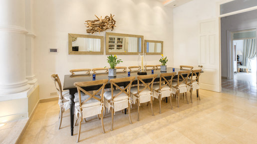 In the second half of the room one sees storm candles and a large black topped dining table and bentwood chairs with seating for fourteen people making it ideal for large, informal dinner parties. An interesting drift wood wall sculpture hangs above Moroccan mirrors. The kitchen also adjoins the terrace should diners prefer to eat outside with its mixture of cushioned rattan furniture and drop down bamboo blinds should the sun become a little too strong during the day. During the evening, there can be no doubt that it is a wonderful vantage point from which to watch the world go by as the terrace overlooks the triangular Piazza with its fountain, small cafes, restaurants and protected Ballutta oak trees.