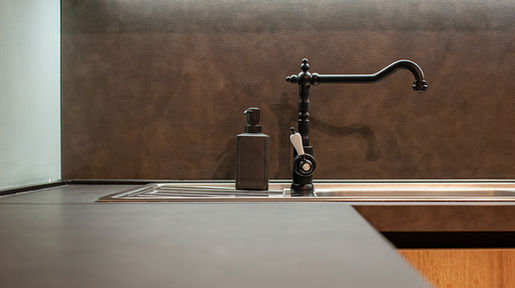 The kitchen is functional and stylish and is made from a wood look material that contrasts pleasingly against the light coloured ceramic flooring. The ceramic hob has been placed in front of the window and enjoys the view and also benefits from an unusual remote controlled circular extractor above that can be lowered or heightened as desired. The antique style wrought iron tap set in this modern context is a nice touch and again reflects the theme of old and new that is found throughout. A simple steel shelf unit also adds to the semi industrial look that characterises the room.